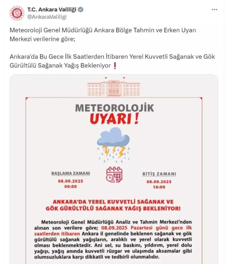 ANKARA Valiliği, bugün gece saatlerinden itibaren kentte etkili olması beklenen gök gürültülü sağanak nedeniyle sel ve su baskınlarına karşı uyardı.Valiliğin...