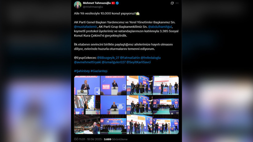 Kura çekimini sosyal medya hesabından duyuran Şahinbey Belediye Başkanı Mehmet Tahmazoğlu, 3 bin 385 konut için kura çekiminin tamamlandığını duyurdu.