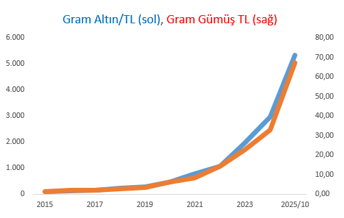 Altın ve gümüş fiyatları dolarla belirlendiği için bu durum Türk yatırımcısı açısından ikili bir kazanca kapı aralıyor: (1) Altın ve gümüş fiyatları güvenli liman yaklaşımıyla arttığı için kazanç sağlanıyor. (2) Türk Lirası dolara karşı değer kaybettiği için oradan da kazanç sağlanıyor. Dolar düşer altın artarsa ya da altın düşer dolar artarsa kazanç var. İkisi birden artarsa doğal olarak daha fazla kazanç söz konusu oluyor. Ancak hem dolar kuru hem de altın ve gümüş fiyatları düşerse kayıp söz konusu olur ki bu da çok sık görülen bir durum değil.