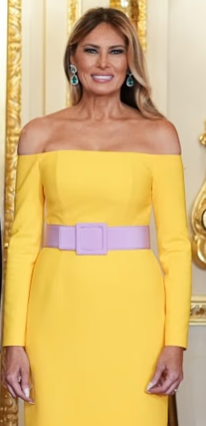 Melania, omuzları açık, uzun sarı bir elbise giydi. Ancak fotoğraflar yayımlanınca büyük bir tartışma başladı. Elbise bazı karelerde parlak sarı, bazılarında ise daha soluk “tereyağı sarısı” gibi görünüyordu. Kemerinin rengi konusunda da kafa karışıklığı vardı: Toz pembe mi yoksa mor mu?